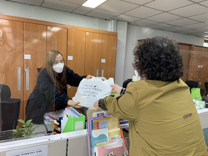 경기 여주시 가남읍행정복지센터는 최근 방문객 중 방역취약 계층을 대상으로 마스크 등 개인방역 물품으로 구성된 코로나19 안심방역꾸러미를 제작하고 안심방역 나눔을 시작했다. 사진은 센터 관계자가 방문객에게 안심방역 꾸러미를 전달하고 있는 모습. (사진제공=여주시청)