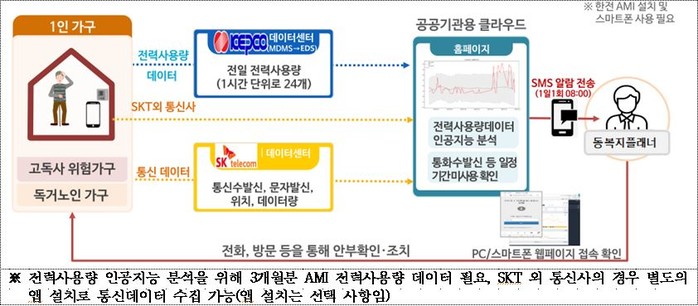 서비스 대상은 ▲저출산, 고령화 등 사회구조 변화와 이혼·실직으로 인한 가족해체 등으로 가족과 지역사회에서 고립 위험이 있는 중장년 1인가구와 ▲그외 상시모니터링이 필요한 가구 중, 통신·전력 데이터 수집 및 분석에 동의한 1인 취약계층 100여명을 대상으로 8~12월 5개월간 시범사업을 실시한다.