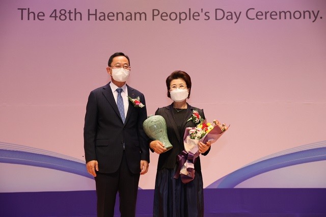 | ▲ 명현관 해남군수가 제 48회 해남군민의 날 기념식에서 해남군민의 상 수상자인 정영희 사회복지법인 두성재단 대표이사와 기념촬영을 하고 있다. / 사진=해남군 제공 |