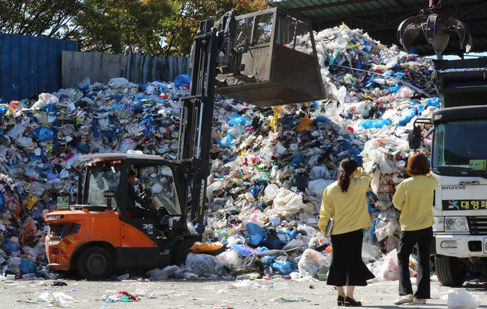 5일 오전 광주 북구의 재활용품 선별장에서 북구청 자원순환팀 직원들이 추석 연휴 기간 쏟아져 나온 일회용품 처리 상황 등을 점검하고 있다.