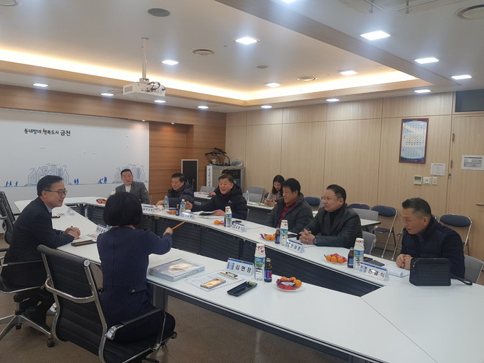 서울 금천구는 지난 13일 오후 4시 구청 소회의실에서 지역상권 활성화를 위한 간담회를 개최했다. 간담회에는 유성훈 구청장과 금천구 ‘현대시장’, ‘남문시장’, ‘은행나무시장’, ‘대명여울빛거리’, ‘독산동 우시장’, ‘독산동 맛나는거리 상점가’ 등 총 6개 전통시장 및 상점가 상인회장들이 참석했다. 사진은 유 구청장(왼쪽)이 상인들과 이야기를 나누는 모습. (사진제공=금천구청)