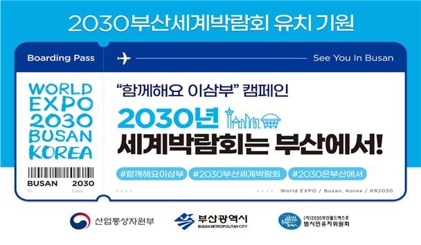 부산시와 정부는 ‘2030 부산세계박람회‘ 유치에 대한 국민의 관심을 높이고 유치 열기 확산을 위해 지난달 23일 공식 유치신청서 제출을 계기로 ‘함께해요 이삼부‘ 캠페인을 7월부터 9월까지 3개월간 실시한다. ‘이삼부‘는 ‘2030 부산세계박람회는 부산에서‘ 의 줄임말이다.