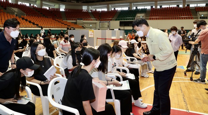 전남도 내 고3 학생 및 고교 교직원들이 19일 코로나19 예방 백신접종을 시작한 가운데 장석웅 전남도교육감이 이날 목포실내체육관 현장을 방문해 접종에 참여한 학생·교직원들을 격려했다. 사진은 이날 장 교육감(오른쪽)이 접종에 참여한 학생들과 대화를 나누고 있는 모습. (사진제공=전라남도교육청)