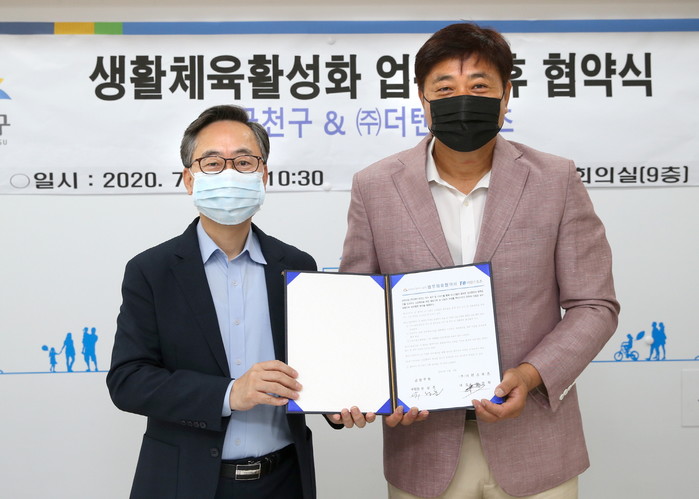 서울 금천구가 지역 생활체육 활성화를 위해 지난 2일 ‘(주)더텐스포츠’와 업무협약을 체결했다. 이 업무협약을 통해 스포츠 활동을 위한 인프라 운영, 프로그램 운영 등을 통해 청소년들의 체력 증진 등을 협력하기로 했다. 사진은 유성훈 구청장(왼쪽)과 야구해설가로 활동하고 있는 양준혁 (주)더텐스포츠 대표가 기념촬영을 하는 모습. (사진제공=금천구청)