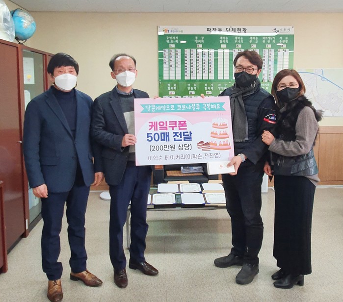 경기 수원시 장안구 파장동에 위치한 이학순 베이커리에서 6일 파장동 행정복지센터에 방문해 저소득층 한부모 가정을 위한 200만원 상당의 ‘케이크 상품권’을 기부했다. 사진은 관계자들이 기념촬영을 하고 있는 모습. (사진제공=장안구청)
