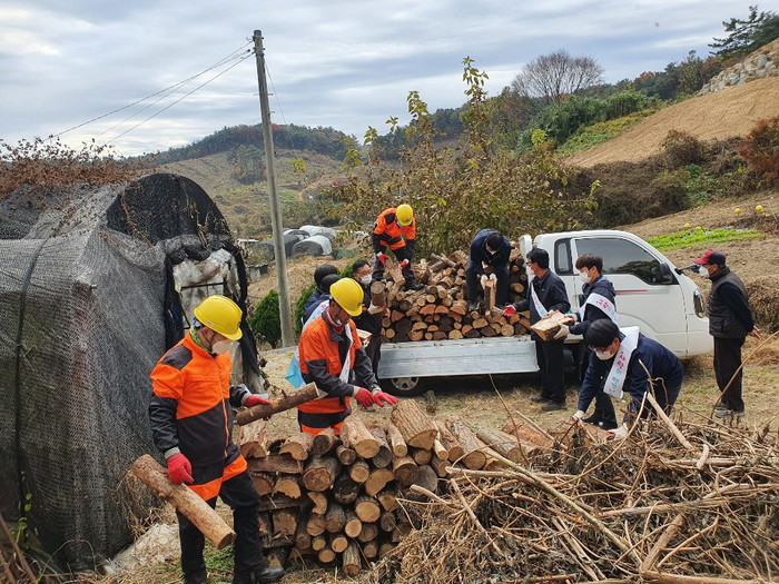 충남 아산시가 최근 숲가꾸기 사업 과정에서 나오는 부산물을 수집해 지역내 취약계층에게 난방용 땔감으로 재활용해 공급하는 '사랑의 땔감나누기' 행사를 진행했다. 사진은 시와 산림조합 직원들이 땔감을 배달하고 있는 모습. (사진제공=아산시청)
