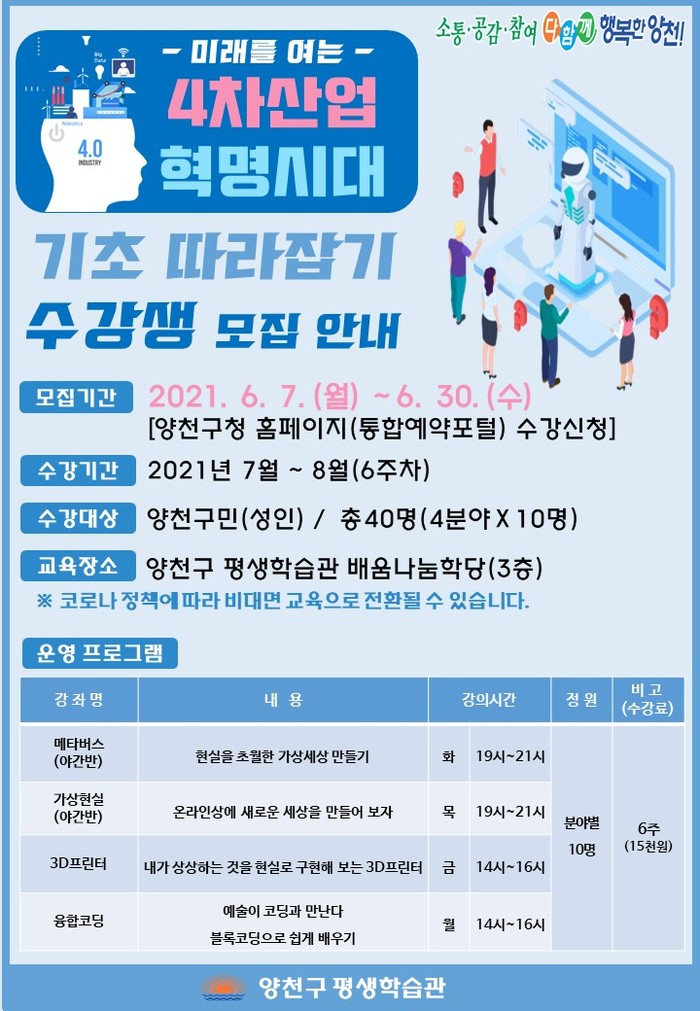 [시민일보 = 이대우 기자] 양천구(구청장 김수영)가 오는 30일까지 메타버스를 포함한 가상현실(VR·AR), 3D프린팅, 융복합 코딩을 포함한 4차 산업기술 미래교육 프로그램 6주 과정 참가자를 선착순 10명 모집한다.