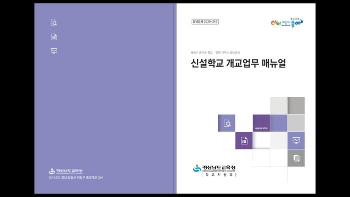 이번 매뉴얼은 수요자 맞춤 중심으로 교육지원청에서 학교신설 추진 시 필요한 내용을 총 4장으로 구성(학생배치, 공립학교 신설, 유치원 신설, 사립학교 신설)한 학교신설업무 매뉴얼과 신설학교에서 개교 시에 필요한 업무를 담은 신설학교 개교업무 매뉴얼로 총 2권으로 제작하였다.