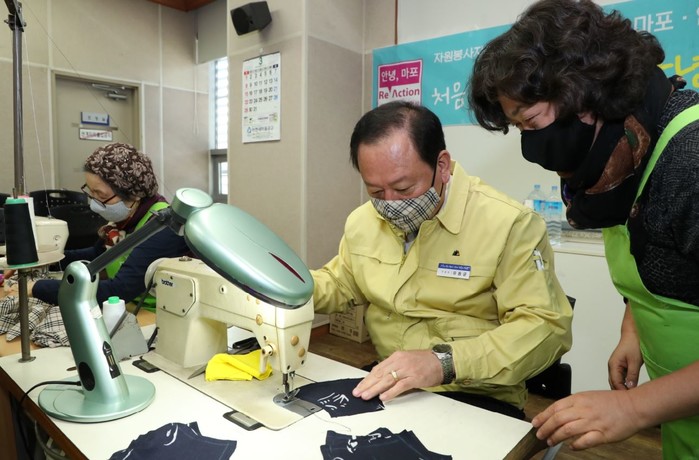 유동균 서울 마포구청장이 최근 서강동 주민센터에서 진행된 '면 마스크 만들기' 봉사활동 현장을 방문해 제작과정 전반을 살펴보고 자원봉사자들과 함께 마스크 만들기에 동참했다. 사진은 지역내 취약계층에게 전달할 마스크를 만들고 있는 유 구청장의 모습. (사진제공=마포구청)