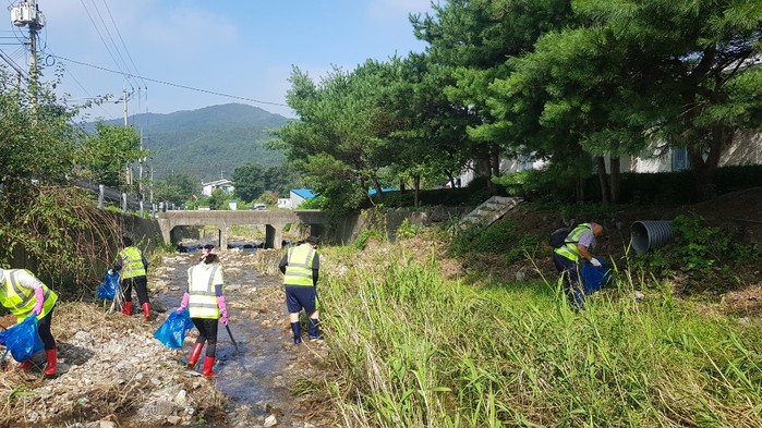 경기 포천시 내촌면은 지난 18~19일 집중호우로 발생한 수해쓰레기 수거를 위한 대청소를 실시했다. 이번 대청소는 희망일자리사업·노인일자리사업과 연계해 진행했으며, 수해쓰레기 수거뿐 아니라 지역내 환경정비도 함께 실시했다. 사진은 하천 주변에서 쓰레기를 수거하고 있는 모습. (사진제공=포천시청)