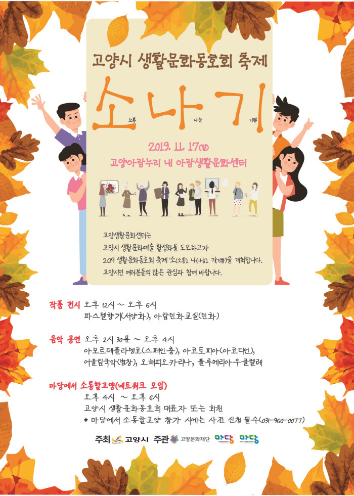 [고양=이기홍 기자] 고양생활문화센터는 오는 17일 12시부터 18시까지 고양문화재단(대표이사 정재왈)이 운영하는 고양아람누리 내 아람생활문화센터에서 2019 고양시 생활문화동호회 축제 ‘소.나.기’를 개최한다.