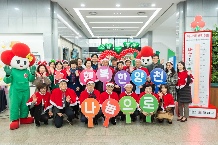 양천구는 최근 구청 1층 로비에서 저소득가구 등 소외된 이웃을 돕기 위해 ‘따뜻한 나눔문화 동행 캠페인’을 개최했다. 사진은 이날 캠페인 현장에 참석한 김수영 구청장(왼쪽)이 직원들과 함께 산타복장을 하고 기념촬영을 하는 모습. (사진제공=양천구청)