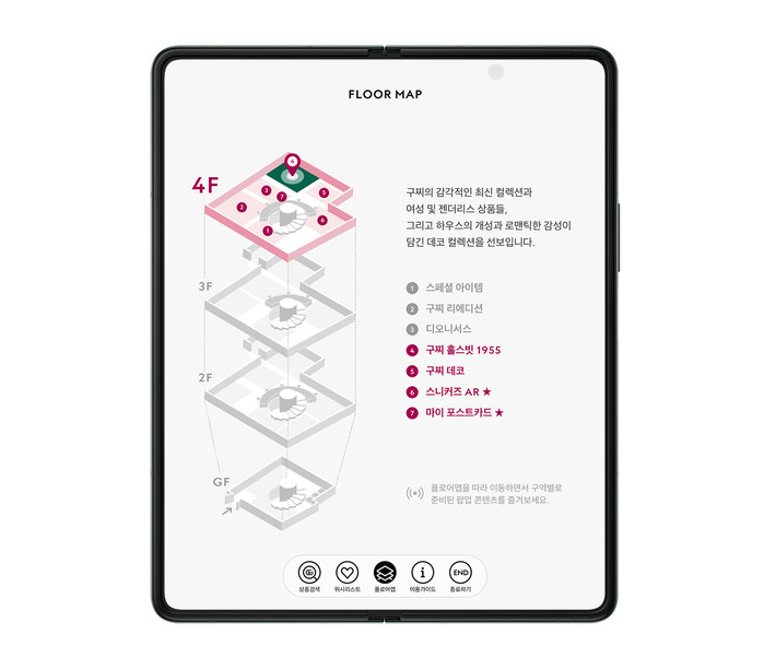 구찌 가옥을 방문하는 고객들은 '가옥 스마트 가이드'로 제품 정보와 위치를 손쉽게 확인해 자기 주도적 쇼핑이 가능하고, 필요할 경우 직원을 자신의 위치로 호출해 대면 커뮤니케이션까지 편리하게 이용할 수 있다.