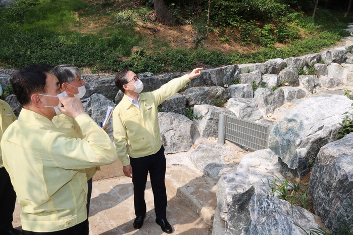 유성훈 서울 금천구청장이 장마를 대비해 16일 재난취약지역 및 시설에 대한 안전점검에 나섰다. 이날 유 구청장은 시흥4동 산사태 취약지역과 가산동 대형 건축공사 현장을 방문해 호우로 인한 토사유출, 흙막이 가시설 붕괴위험 등을 살폈다. 사진은 유 구청장(오른쪽)이 산사태 취약지역을 살피는 모습. (사진제공=금천구청)