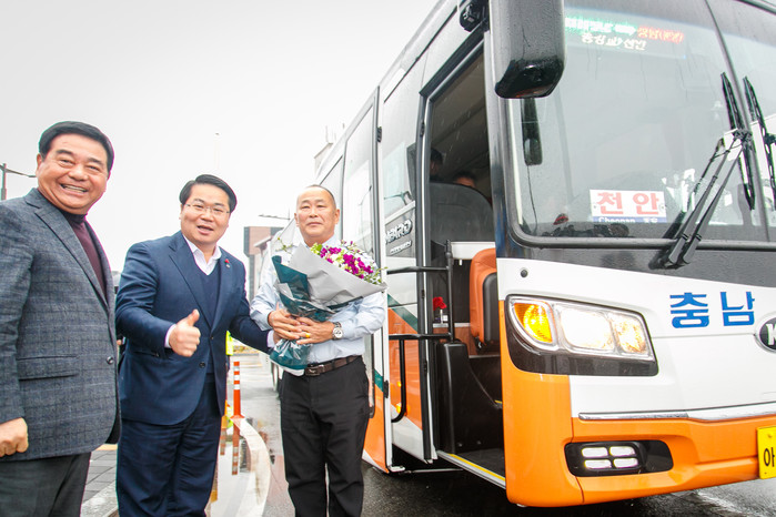 충남 아산시가 17일 배방읍 배방환승정류장에서 '시외·고속버스 운행 개통식'을 개최했다. 이날 행사는 오세현 시장을 비롯 관계자 및 지역주민 등 100여명이 참석한 가운데 진행됐다. 사진은 오 시장(왼쪽에서 두 번째)이 버스기사와 기념촬영하는 모습. (사진제공=아산시청)