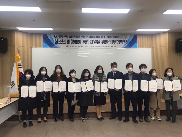 경기 동두천시청소년상담복지센터가 최근 의정부청소년꿈키움센터와 청소년안전망구축 및 지원을 위한 업무협약을 체결했다. 이 협약을 통해 ▲청소년심리상담 ▲학교폭력 예방교육 등을 비롯해 다양한 프로그램 지원한다. 사진은 협약식에서 관계자들이 기념촬영을 하는 모습. (사진제공=동두천시청)