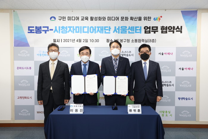 서울 도봉구는 지난 2일 시청자미디어재단 서울시청자미디어센터와 지역 주민 미디어 역량 강화 등을 위한 업무협약(MOU)을 체결했다. 협약으로 주민과 직원의 미디어 역량 증진을 위한 교육 프로그램 기획·운영 등에 협력하게 된다. 사진은 협약식에서 이동진 구청장(왼쪽에서 두 번째)과 관계자들이 기념촬영을 하는 모습. (사진제공=도봉구청)