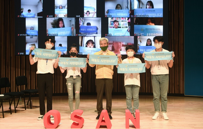 경기 오산시가 27일 소리울도서관에서 아동의 참여권 증진을 위한 '제4대 어린이·청소년의회' 발대식을 온택트(비대면) 방식으로 개최했다. 이날 발대식은 위촉장 전달, 활동 다짐문 낭독, 시장님과의 소통, 아동권리 캠페인 순으로 진행됐다. 사진은 발대식에 참석한 곽상욱 시장(가운데)이 어린이·청소년 의원들과 아동권리 캠페인에 참여하는 모습. (사진제공=오산시청)