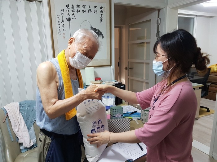 경기 수원시 팔달구 화서2동 지역사회보장협의체는 지난 7일 취약계층 10가구에 백미(10kg) 10포를 전달했다. 이번 백미 전달은 혹서기 ‘사랑의 밥차’ 운영 중단으로 취약계층의 결식이 우려돼 수원시 자원봉사센터에서 지원받아 진행한 것이다. 사진은 협의체 관계자가 노인에게 백미를 전달하고 있는 모습. (사진제공=팔달구청)