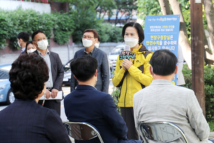 김수영 서울 양천구청장이 최근 목3동 무궁화 어린이공원에서 '제139차 찾아가는 현장구청장실'을 진행하고, 구립 나말어르신사랑방과 목3동 주민 커뮤니티 공유공간 ‘이음’에 들러 노인과 주민들의 이야기를 경청했다. 사진은 김 구청장이 현장구청장실을 진행하고 있는 모습. (사진제공=양천구청)