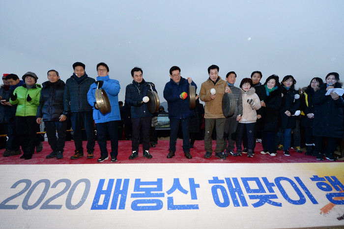 동대문구는 1일 배봉산 정상부 근린공원에서 ‘2020년 배봉산 해맞이 행사’를 개최했다. 사진은 행사에 참석한 유덕열 구청장 내외 및 내빈들이 주민들과 함께 새해를 기념하며 기념타징을 하는 모습. (사진제공=동대문구청)