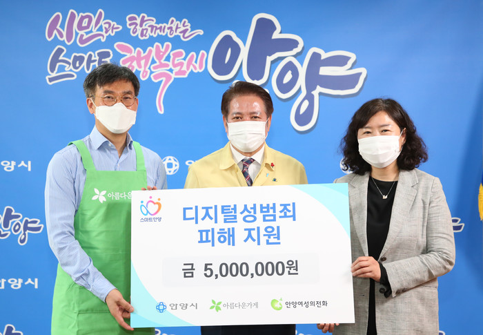 지난 22일 아름다운가게 안양점이 디지털성범죄 피해자 돕기 성금 500만원을 경기 안양시 디지털성범죄지원센터에 전달했다. 이날 전달된 성금은 성범죄 피해자들의 사례관리와 휴대폰 증거복원 등에 쓰일 예정이다. 사진은 성금 전달 후 최대호 시장(가운데)과 관계자들이 기념촬영을 하는 모습. (사진제공=안양시청)