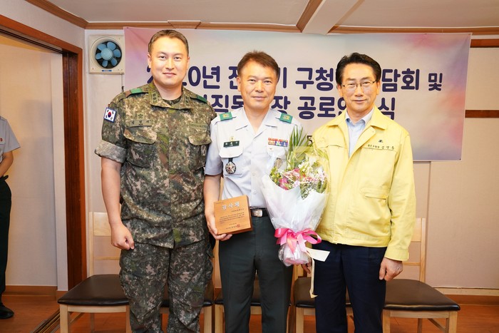 김영종 서울 종로구청장은 최근 ‘2020년 상반기 예비군동대장 간담회’에 참석했다. 이날 김 구청장은 6.25전쟁 70주년 맞아 지역 예비군동대장을 격려하고, 공로연수에 들어가는 사직동 임종수 동대장에게 감사패를 전달했다. 사진은 김 구청장(오른쪽)과 임 동대장(가운데), 김병재 219보병연대 1대대장(왼쪽)의 기념촬영 모습. (사진제공=종로구청)