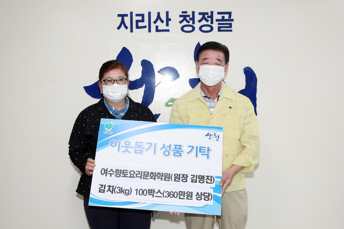 산청군 생비량면 출신의 요리연구가 김명진(여수향토요리문화학원 원장, 한국 슬로푸드 전남연합회 회장) 원장이 3일 산청군을 찾아 김치 100박스를 기부했다.