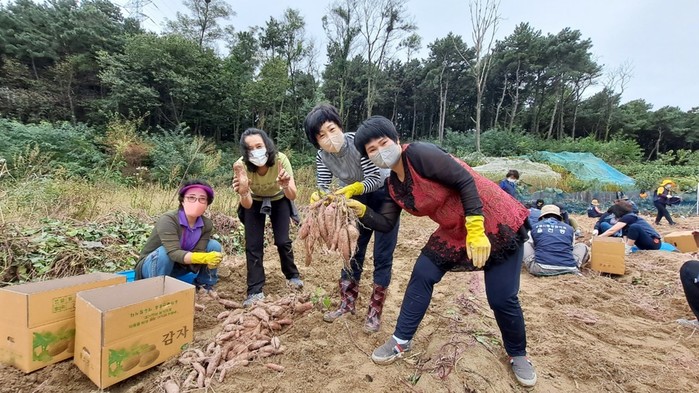 경기 수원시 장안구 율천동 주민자치회는 12일 입북동에 위치한 공동텃밭에서 어려운 이웃에게 나눔을 실천하기 위해 정성으로 기른 고구마 1000kg을 수확했다. 이날 행사에는 주민자치회를 비롯한 통장협의회, 단체장협의회, 새마을문고 등 단체원들이 힘을 보탰으며, 고구마를 판매한 수익금은 연말 저소득층 이웃에게 김치를 전달하는 ‘사랑의 김장 담그기’ 재원으로 사용된다. 사진은 참여자들이 고구마를 들고 기념촬영을 하는 모습. (사진제공=장안구청)