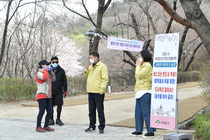 서대문구청 직원들이 '사회적 거리두기'의 일환으로 최근 지역내 안산 자락길 부근에서 산책 나온 시민들을 대상으로 마스크 착용과 거리두기를 안내하고 진입하는 차량을 통제했다. 사진은 시민들에게 마스크 착용을 당부하는 직원들의 모습. (사진제공=서대문구청)