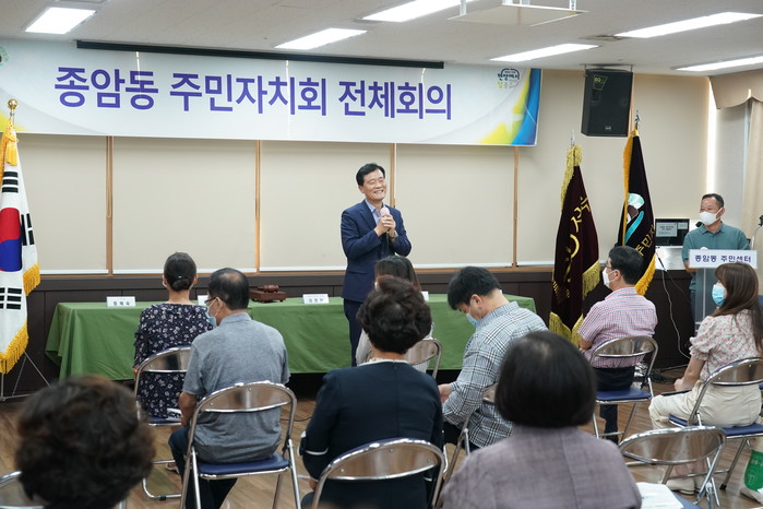 서울 성북구 종암동 제2차 주민자치회 전체회의가 최근 동주민센터 3층 대강당에서 개최됐다. 회의는 코로나19로 인해 주민자치회사업 진행이 변경됨에 따라, 계획을 수립하고 내년 실행 사업을 선정하기 위해 마련됐다. 사진은 회의에 참석한 이승로 구청장이 주민들과 이야기를 나누는 모습. (사진제공=성북구청)