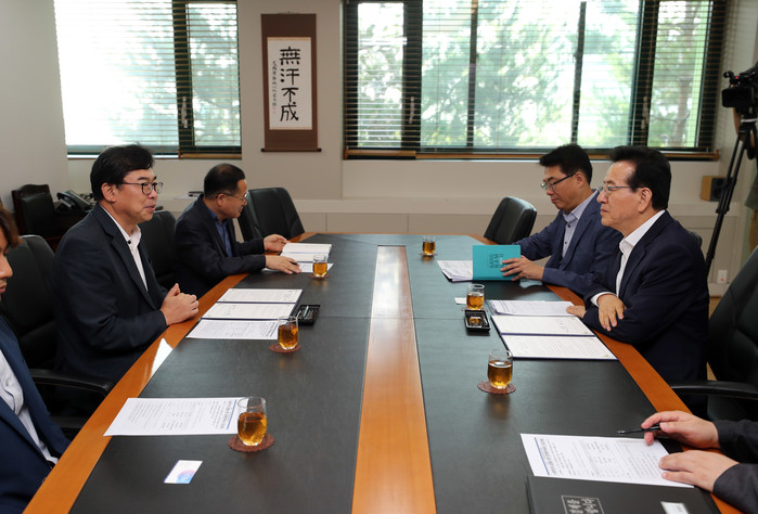 강남구청장이 26일 3층 제1작은회의실에서 지역경제 발전과 일자리 창출에 기여하기 위한 양 기관의 공동협력을 위해 ‘강남구-국민연금공단 서울남부지역본부 업무협약(MOU)’을 채결했다. 사진은 이래광 국민연금공단 서울남부지역본부장과 함께 협약관련 간담을 나누고 있는 정순균 구청장(오른쪽)의 모습. (사진제공=강남구청)