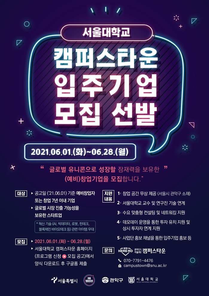 [시민일보 = 여영준 기자] 관악구(구청장 박준희)는 서울대학교와 함께 오는 28일까지 캠퍼스타운 입주기업을 모집한다고 7일 밝혔다.