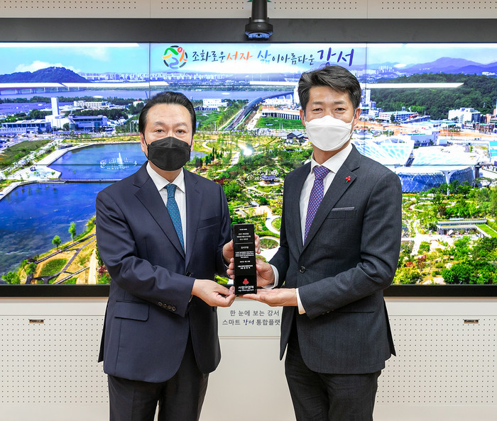 서울 강서구는 최근 ‘2021년 희망온돌 따뜻한 겨울나기 사업 평가’에서 우수 자치구로 선정됐다. 구가 지난해 11월부터 3개월간 모은 성금·품은 28억9216만원으로 지난해보다 4.4% 증가했다. 사진은 노현송 구청장(왼쪽)이 김진곤 서울사회복지공동모금회 사무처장으로부터 표창을 받고 있는 모습. (사진제공=강서구청)