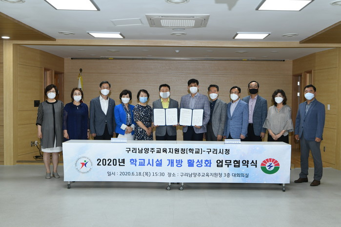 경기 구리시와 구리남양주교육지원청이 18일 지역내 신규 실내체육관 건립 중인 11개 학교장과 함께 '구리시 학교시설 개방 활성화'를 위한 업무 협약을 체결했다. 사진은 협약 후 안승남 시장(왼쪽 여섯 번째)과 관계자들이 기념촬영을 하는 모습. (사진제공=구리시청)