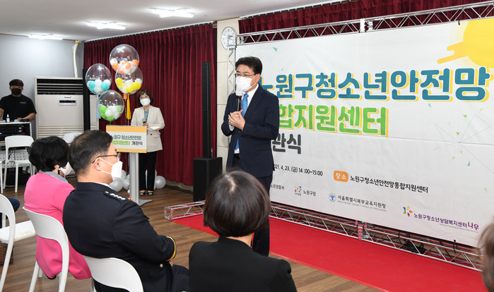오승록 서울 노원구청장이 최근 청소년안전망 통합지원센터(상계로23길 17) 개관식에 참석했다. 청소년안정망통합지원센터는 120.3㎡ 규모에 2개의 상담실·프로그램실 등을 갖추고 있다. 사진은 오 구청장이 인사말을 하는 모습. (사진제공=노원구청)