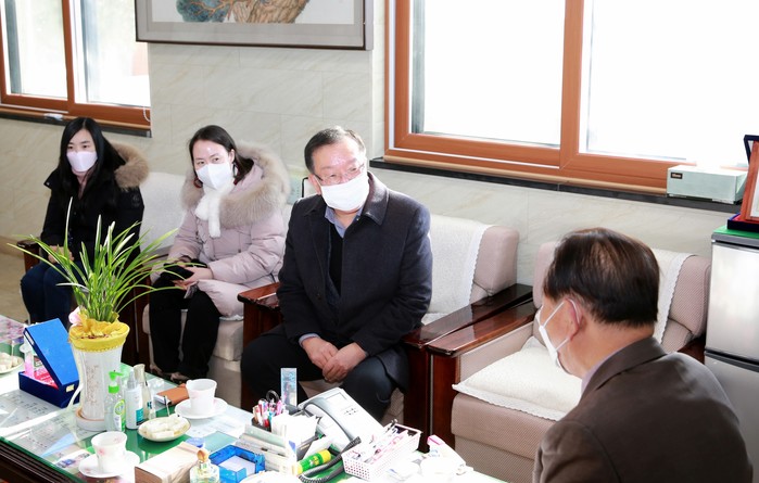 경기 수원시 장안구는 7일 영화동에 위치한 ‘대한노인회 장안구지회’를 방문해 신년인사와 함께 코로나19로 사회활동이 크게 줄어든 노인들의 건강관리방법과 한파 대비 행동요령 등을 안내하고 노인일자리 사업 등을 논의했다. 사진은 이날 이범선 구청장이 장안구지회 관계자들과 이야기를 하고 있는 모습. (사진제공=장안구청)