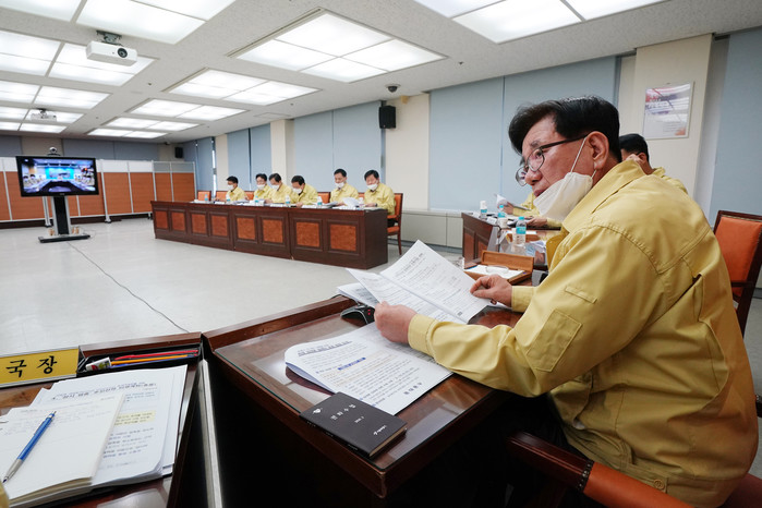 유덕열 동대문구청장이 지난 9일 오후 3시, ‘시장-구청장 긴급 비상대책영상회의’에서 박원순 서울시장, 타 자치구청장들과 함께 코로나19 관련 비상대책을 논의했다. 사진은 유 구청장과 구 간부들이 ‘시장-구청장 긴급 비상대책영상회의’에 참여하고 있는 모습. (사진제공=동대문구청)