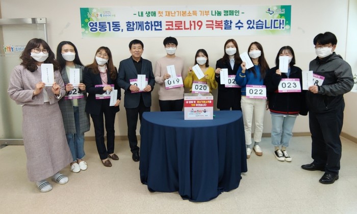 경기 수원시 영통구 영통1동 직원들이 지난 최근 '내 생애 첫 재난기본소득 기부 나눔 캠페인'에 동참하며 48만원의 모금액을 경기사회복지공동모금회에 전달했다. 사진은 전달식에 참석한 관계자들이 기념촬영을 하는 모습. (사진제공=영통구청)
