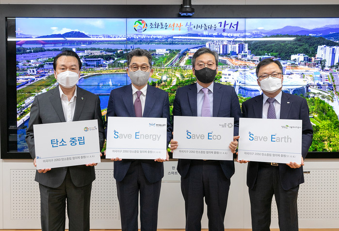 강서구는 지난 8일 마곡산업단지 입주기업협의회, LG사이언스파크, 서울에너지공사와 ‘마곡산업단지 탄소중립 협의체 구성을 위한 업무협약(MOU)’을 체결했다. 협약으로 각 기관은 지구단위 수요반응자원(DR) 등 5가지 사업 분야에서 협력하기로 했다. 사진은 협약식에서 노현송 구청장(왼쪽)이 관계자들과 기념촬영을 하는 모습. (사진제공=강서구청)