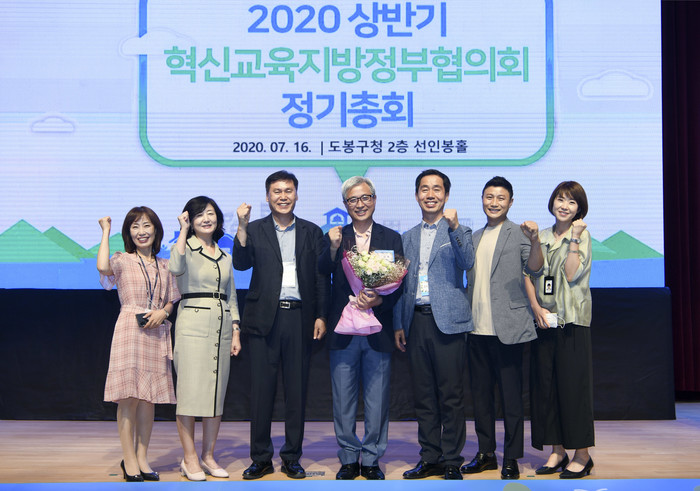 곽상욱 경기 오산시장이 16일 서울 도봉구청에서 진행된 혁신교육지방정부협의회 상반기 정기총회에서 혁신교육지방정부협의회 제3대 회장으로 선출됐다. 사진은 곽 시장(가운데)이 관계자들과 꽃다발을 들고 기념촬영을 하는 모습. (사진제공=오산시청)