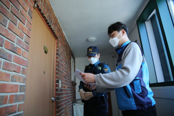 서울 관악구가 최근 급격히 증가한 해외 입국 자가격리자의 자가격리 의무 위반을 막기 위해 관악경찰서와 함께 2인 1조, 5개반을 편성, 자가격리자 거주지에 불시 방문해 자가격리 준수 여부 등에 대해 점검하고 있다. 사진은 자가격리자 거주지에 방문한 모습. (사진제공=관악구청)