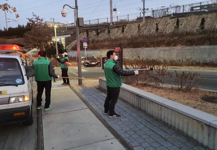 서울 마포구가 지난 4일부터 신종 코로나바이러스 감염증(우한 폐렴)이 급속하게 확산됨에 따라 새마을지도자협의회와 6개조의 새마을 자율방역대를 편성해 홍대 걷고싶은거리·홍통거리, 경의선책거리, 경의선숲길 등을 대상으로 자율방역작업을 하고 있다. 사진은 방역작업 모습. (사진제공=마포구청)