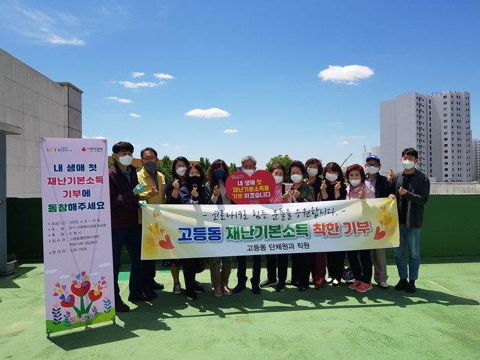 경기 수원시 팔달구 고등동은 최근 동 행정복지센터 옥상에서 9개 단체장과 함께 ‘내 생애 첫 재난기본소득 착한 기부식’을 했다. 사진은 기부식에 참석한 관계자들이 기념촬영을 하는 모습. (사진제공=팔달구청)
