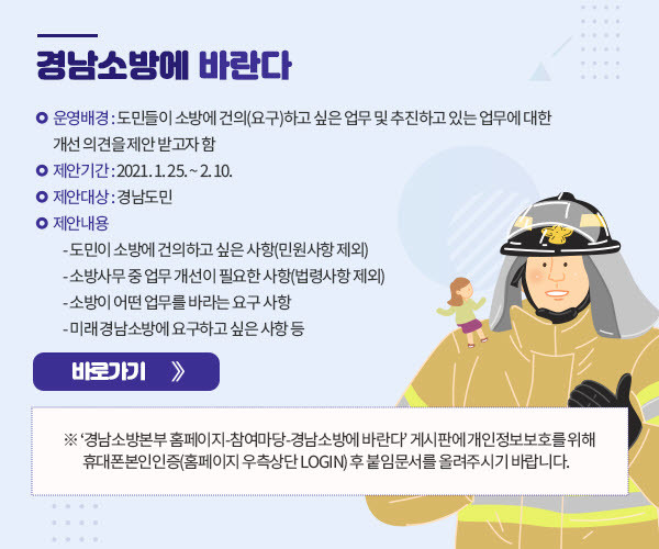 제안방법은 “경남소방본부 홈페이지-참여마당-경남소방에 바란다” 게시판에 개인정보보호를 위해 휴대폰 본인인증(홈페이지 우측상단 LOGIN) 후 첨부파일을 작성해 등록하면 된다.