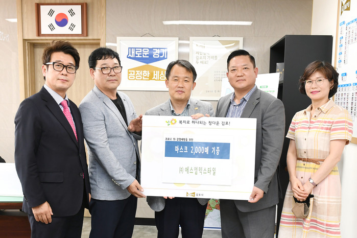 경기 김포시는 (주)에스엠텍스타일로부터 코로나19 방역활동을 위해 노력 중인 시청 직원들을 위한 항균·항취 생활 마스크 2000장을 전달받았다. 사진은 기탁식에서 최병갑 부시장(가운데)과 관계자들이 기념촬영을 하고 있는 모습. (사진제공=김포시청)