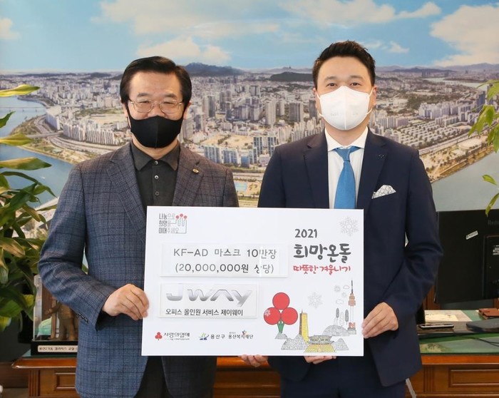 서울 용산구는 22일 제이웨이로부터 지역내 취약계층을 위한 KF-AD 마스크 10만장(2000만원 상당)을 전달받았다. 사진은 전달식에서 성장현 구청장(왼쪽)과 서정원 이사가 기념촬영을 하는 모습. (사진제공=용산구청)