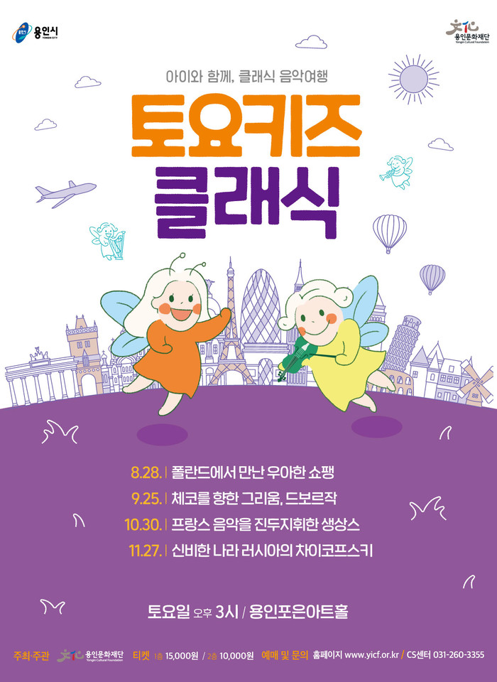 11월 <토요키즈클래식>은 오는 3일(수) 오후 2시에 티켓 오픈 예정이며, 만48개월 이상 관람 가능하다. 1층 1만5천원, 2층 1만원으로 구성되었으며, 공연티켓은 용인문화재단 홈페이지(www.yicf.or.kr)와 인터파크 티켓, 전화(031-260-3355/3358)를 통해 사전예매가 가능하다.