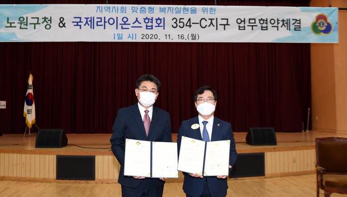서울 노원구가 지역내 저소득 주민을 위한 다양한 후원 및 결연사업 등 지역의 복지욕구에 기반한 맞춤형 복지서비스를 제공하기 위해 최근 국제라온스협회 354-C지구와 업무협약을 체결했다. 사진은 협약 체결 후 오승록 구청장(왼쪽)이 관계자와 기념촬영을 하는 모습. (사진제공=노원구청)