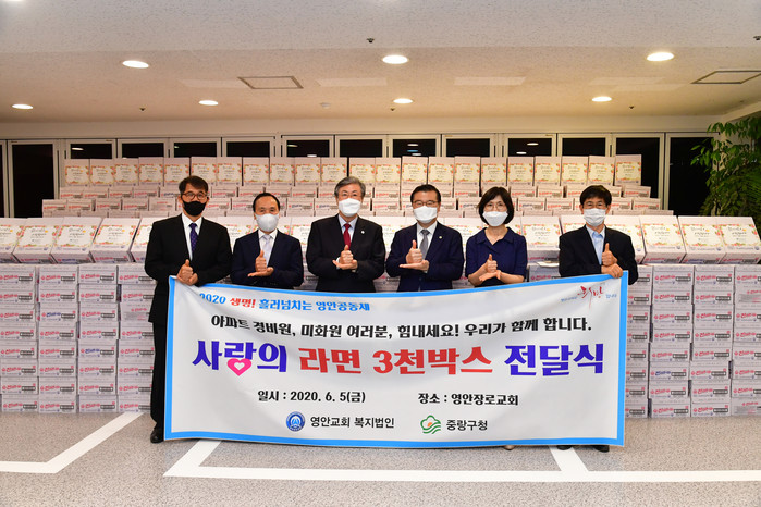 서울 중랑구는 지난 5일 영안교회로부터 라면 3000박스(4000만원 상당)을 기탁받았다. 라면은 지역내 아파트 경비원 및 청소부, 저소득층 주민등에게 전달될 예정이다. 사진은 전달식에 참석한 류경기 구청장(왼쪽에서 네 번째)이 관계자들과 '덕분에' 포즈를 취하고 있는 모습. (사진제공=중랑구청)